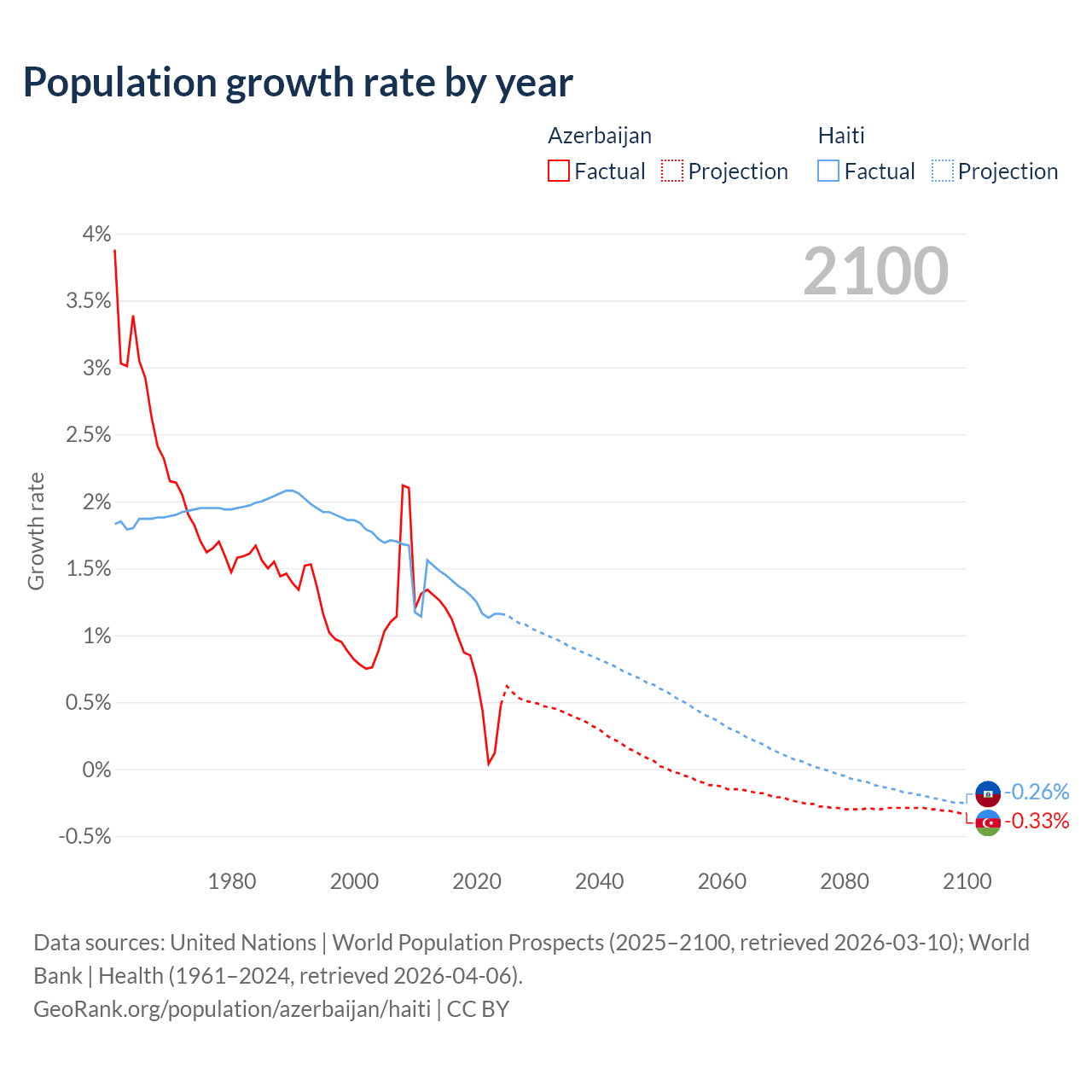 - For the last 10 years, Azerbaijan has had an average growth rate of +0.73% per year vs +1.29% in Haiti.