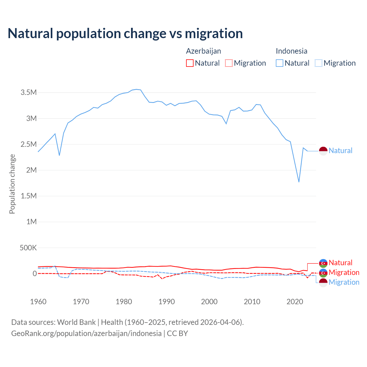 Over the last 10 years, 87.2% of the population change in Azerbaijan is from natural causes (a gain of 782,840 people) and 12.8% is from migration (a loss of 114,572 people). In Indonesia 98.9% is from natural causes (a gain of 25,242,860 people) and 1.1% is from migration (a loss of 280,258 people).