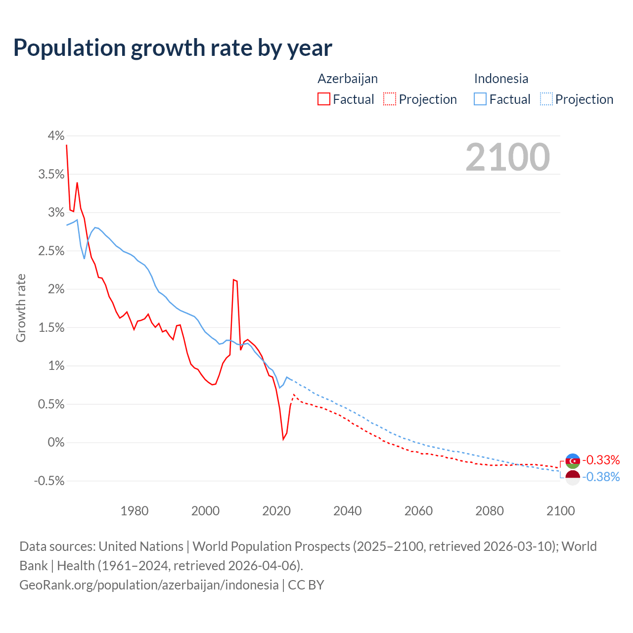 - For the last 10 years, Azerbaijan has had an average growth rate of +0.73% per year vs +0.94% in Indonesia.