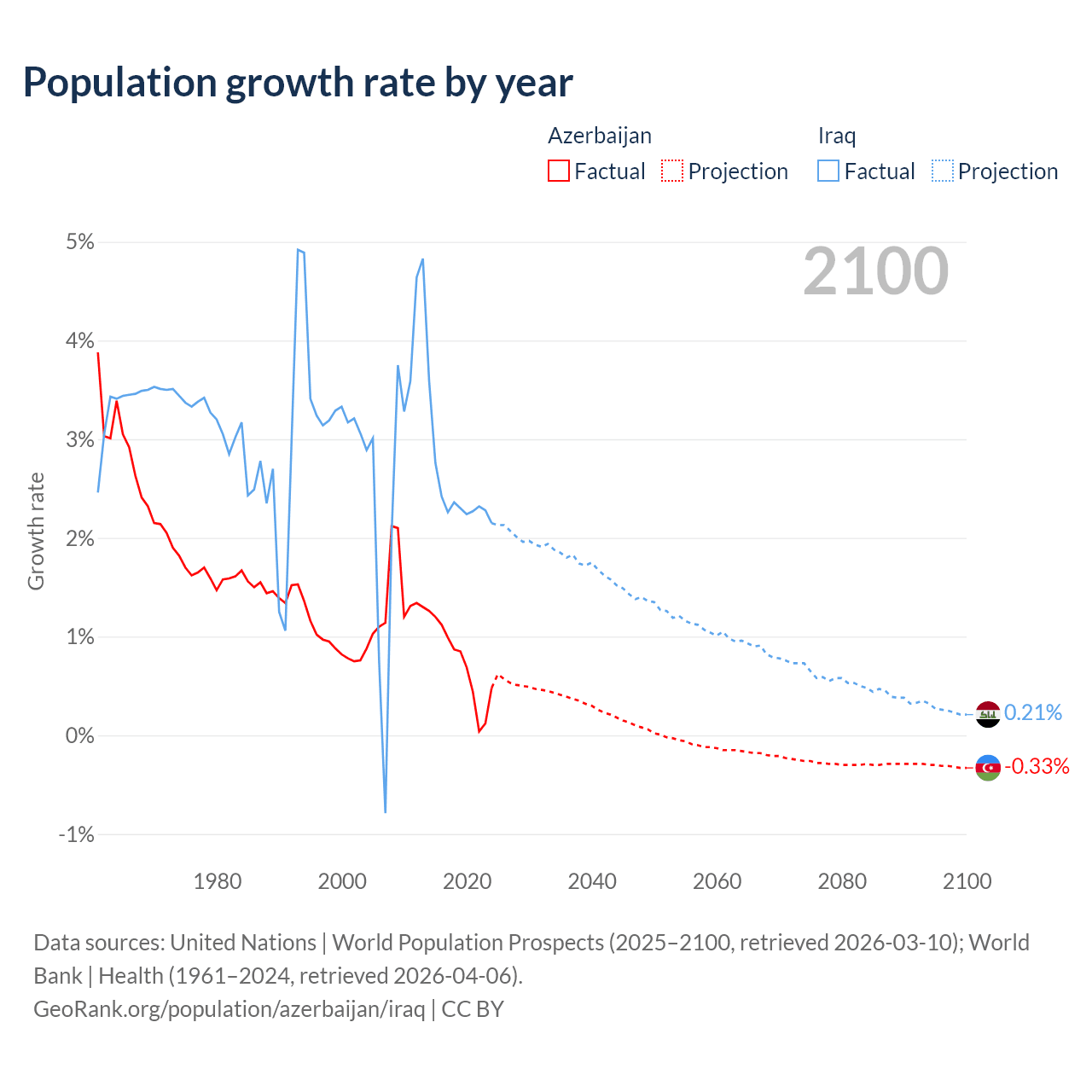 - For the last 10 years, Azerbaijan has had an average growth rate of +0.73% per year vs +2.45% in Iraq.