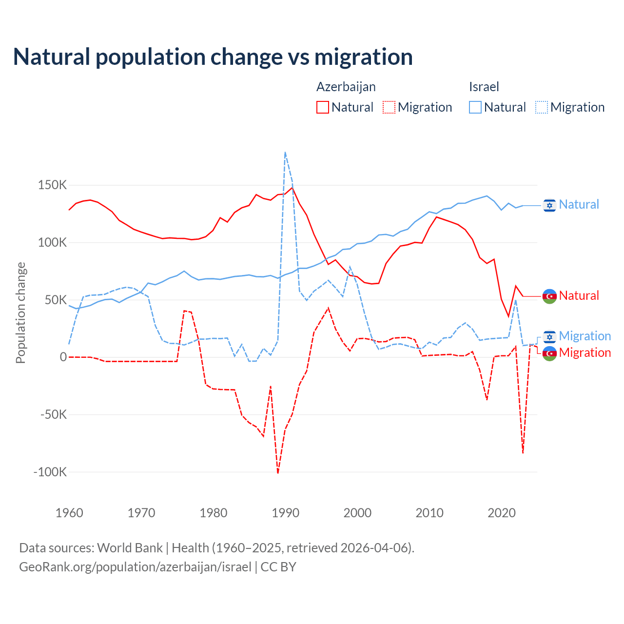 Over the last 10 years, 87.2% of the population change in Azerbaijan is from natural causes (a gain of 782,840 people) and 12.8% is from migration (a loss of 114,572 people). In Israel 86% is from natural causes (a gain of 1,343,492 people) and 14% is from migration (a gain of 219,048 people).