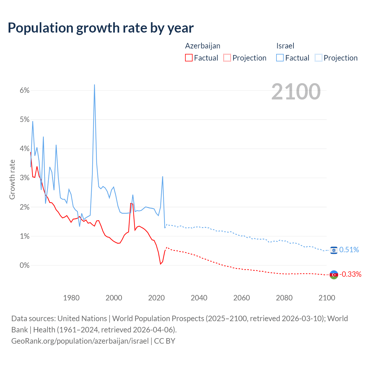 - For the last 10 years, Azerbaijan has had an average growth rate of +0.73% per year vs +1.96% in Israel.
