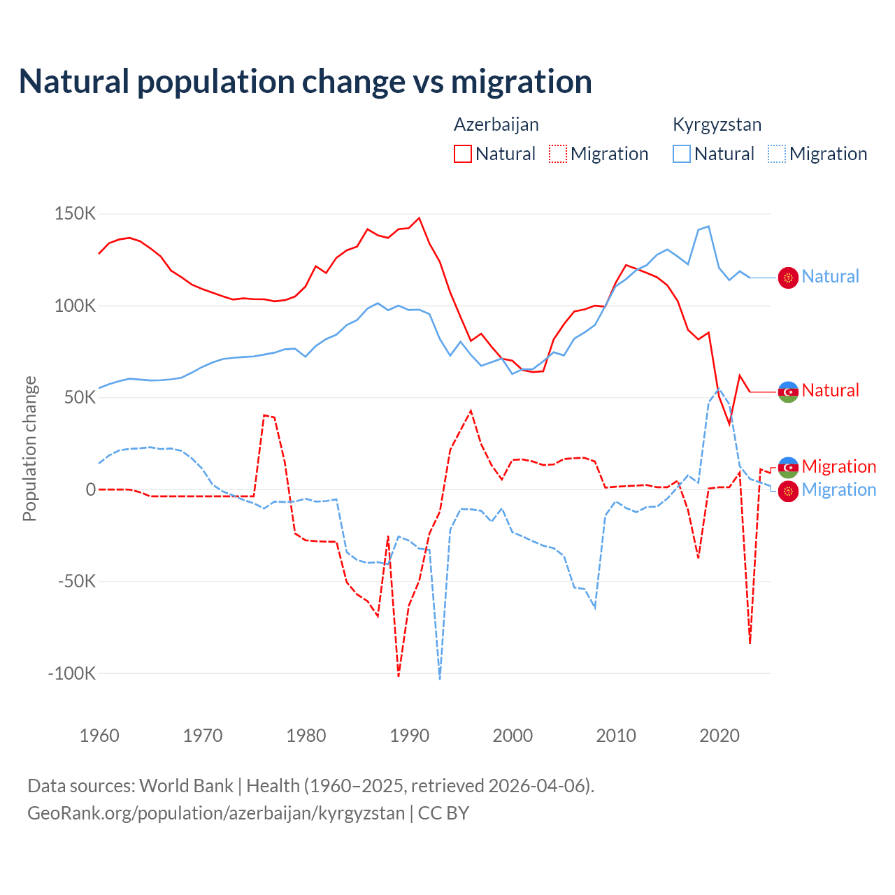 Over the last 10 years, 87.2% of the population change in Azerbaijan is from natural causes (a gain of 782,840 people) and 12.8% is from migration (a loss of 114,572 people). In Kyrgyzstan 88.5% is from natural causes (a gain of 1,258,837 people) and 11.5% is from migration (a gain of 164,132 people).