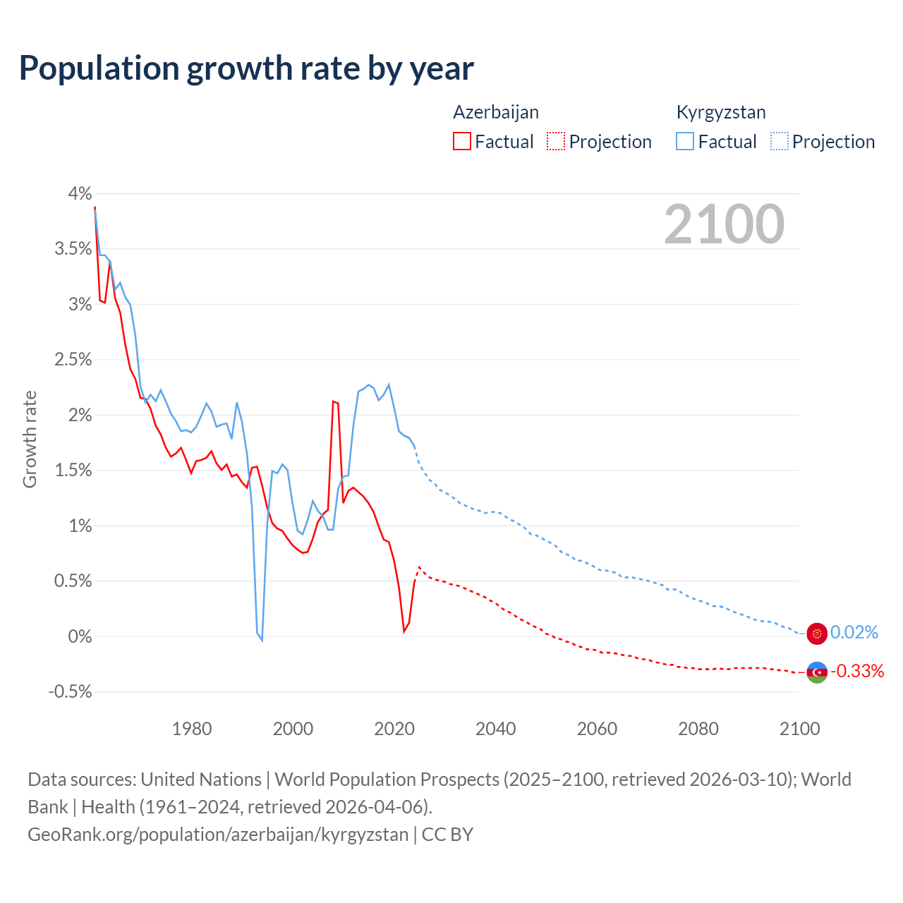 - For the last 10 years, Azerbaijan has had an average growth rate of +0.73% per year vs +2.05% in Kyrgyzstan.