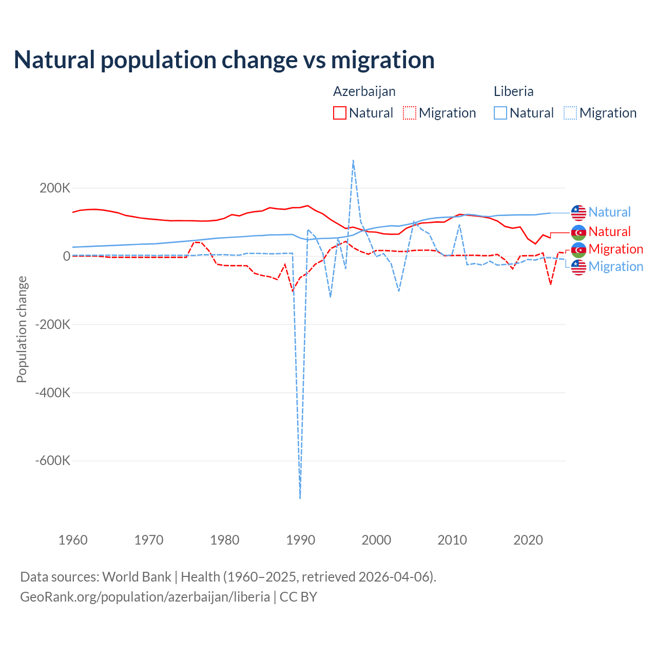 Over the last 10 years, 87.2% of the population change in Azerbaijan is from natural causes (a gain of 782,840 people) and 12.8% is from migration (a loss of 114,572 people). In Liberia 87.7% is from natural causes (a gain of 1,202,387 people) and 12.3% is from migration (a loss of 168,316 people).
