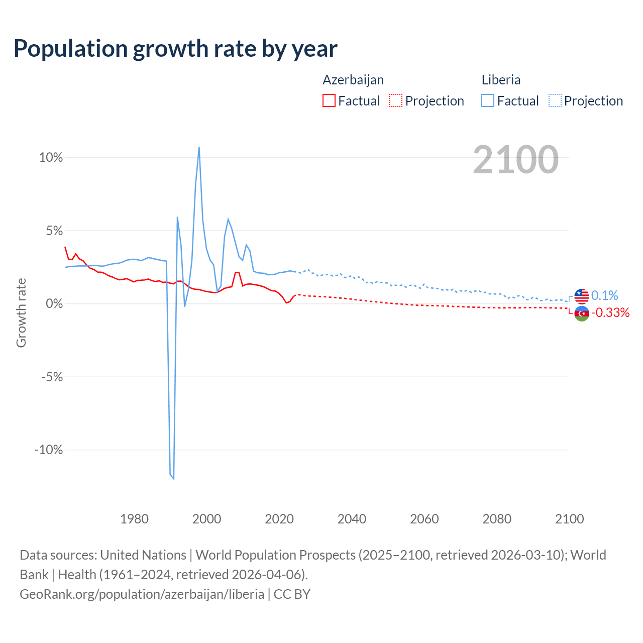 - For the last 10 years, Azerbaijan has had an average growth rate of +0.73% per year vs +2.09% in Liberia.