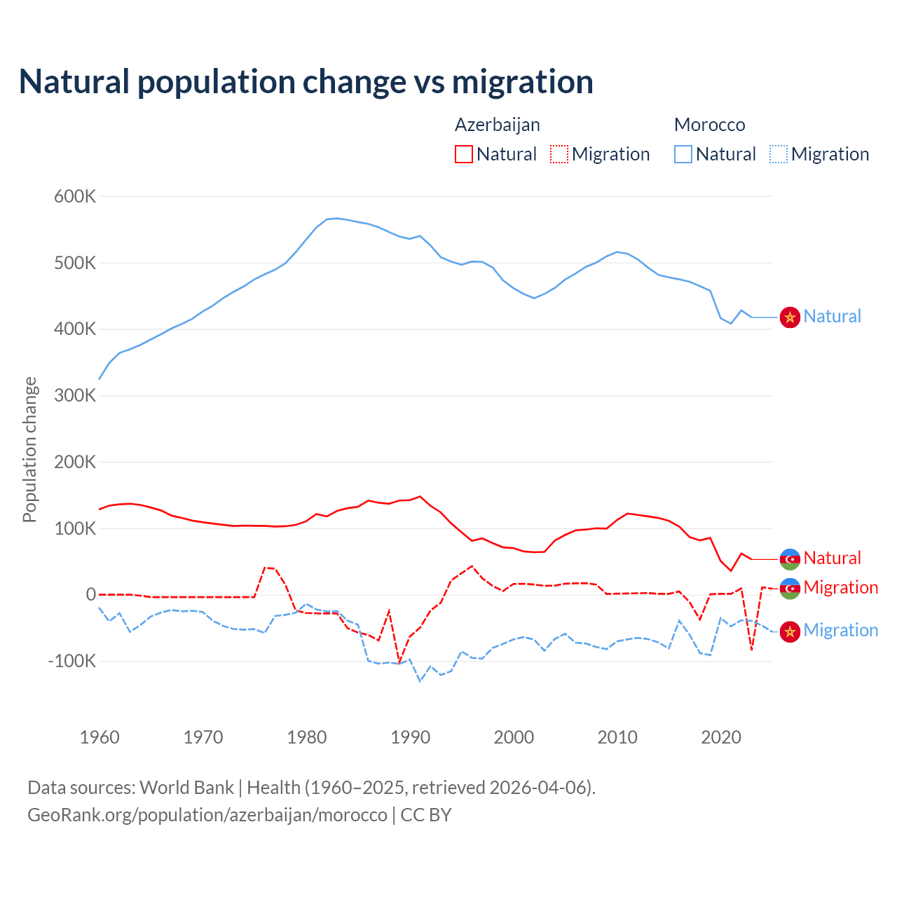 Over the last 10 years, 87.2% of the population change in Azerbaijan is from natural causes (a gain of 782,840 people) and 12.8% is from migration (a loss of 114,572 people). In Morocco 88.3% is from natural causes (a gain of 4,495,223 people) and 11.7% is from migration (a loss of 594,083 people).