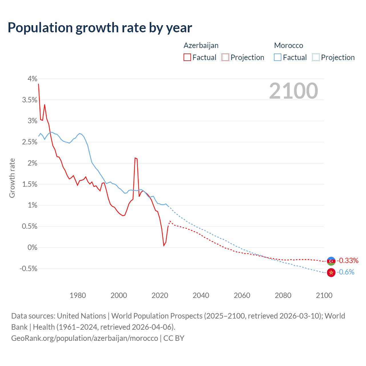 - For the last 10 years, Azerbaijan has had an average growth rate of +0.73% per year vs +1.09% in Morocco.