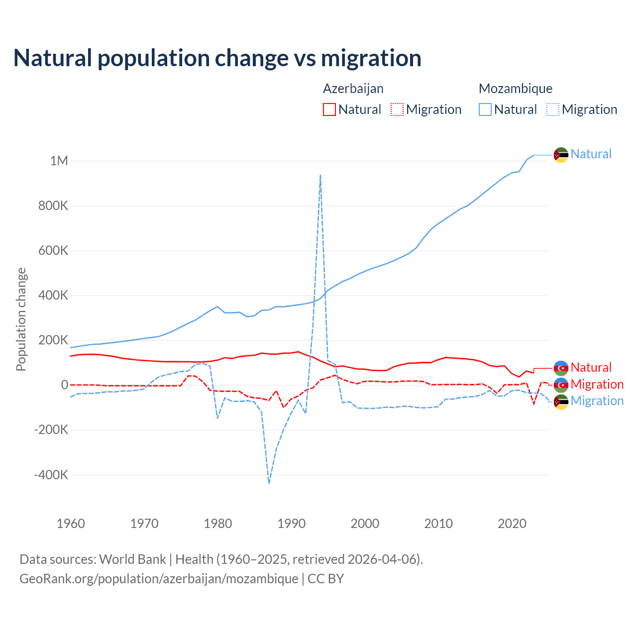 Over the last 10 years, 87.2% of the population change in Azerbaijan is from natural causes (a gain of 782,840 people) and 12.8% is from migration (a loss of 114,572 people). In Mozambique 95.9% is from natural causes (a gain of 9,108,203 people) and 4.15% is from migration (a loss of 393,923 people).