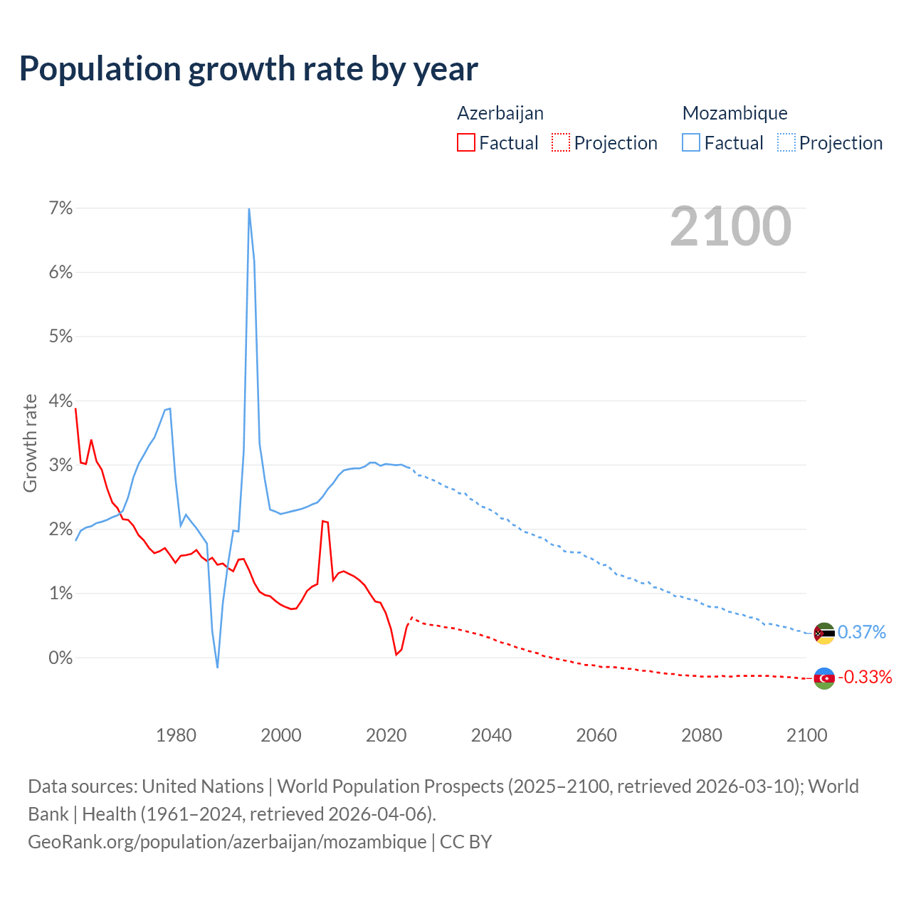 - For the last 10 years, Azerbaijan has had an average growth rate of +0.73% per year vs +2.99% in Mozambique.