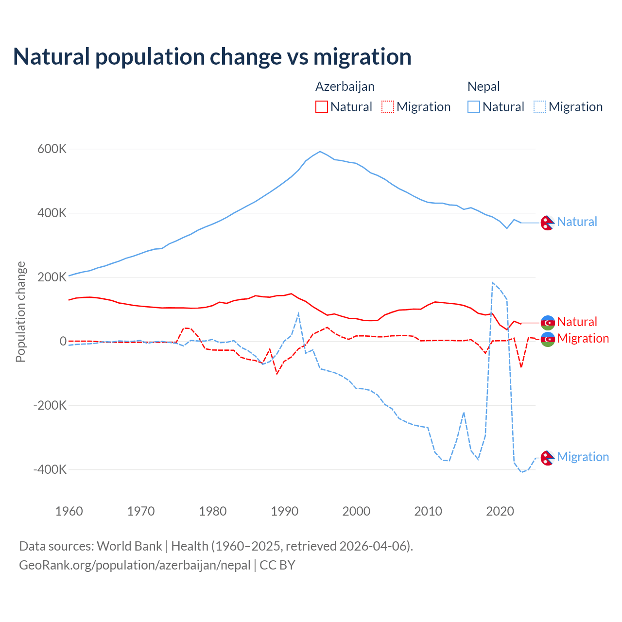 Over the last 10 years, 87.2% of the population change in Azerbaijan is from natural causes (a gain of 782,840 people) and 12.8% is from migration (a loss of 114,572 people). In Nepal 67.9% is from natural causes (a gain of 3,909,749 people) and 32.1% is from migration (a loss of 1,851,664 people).