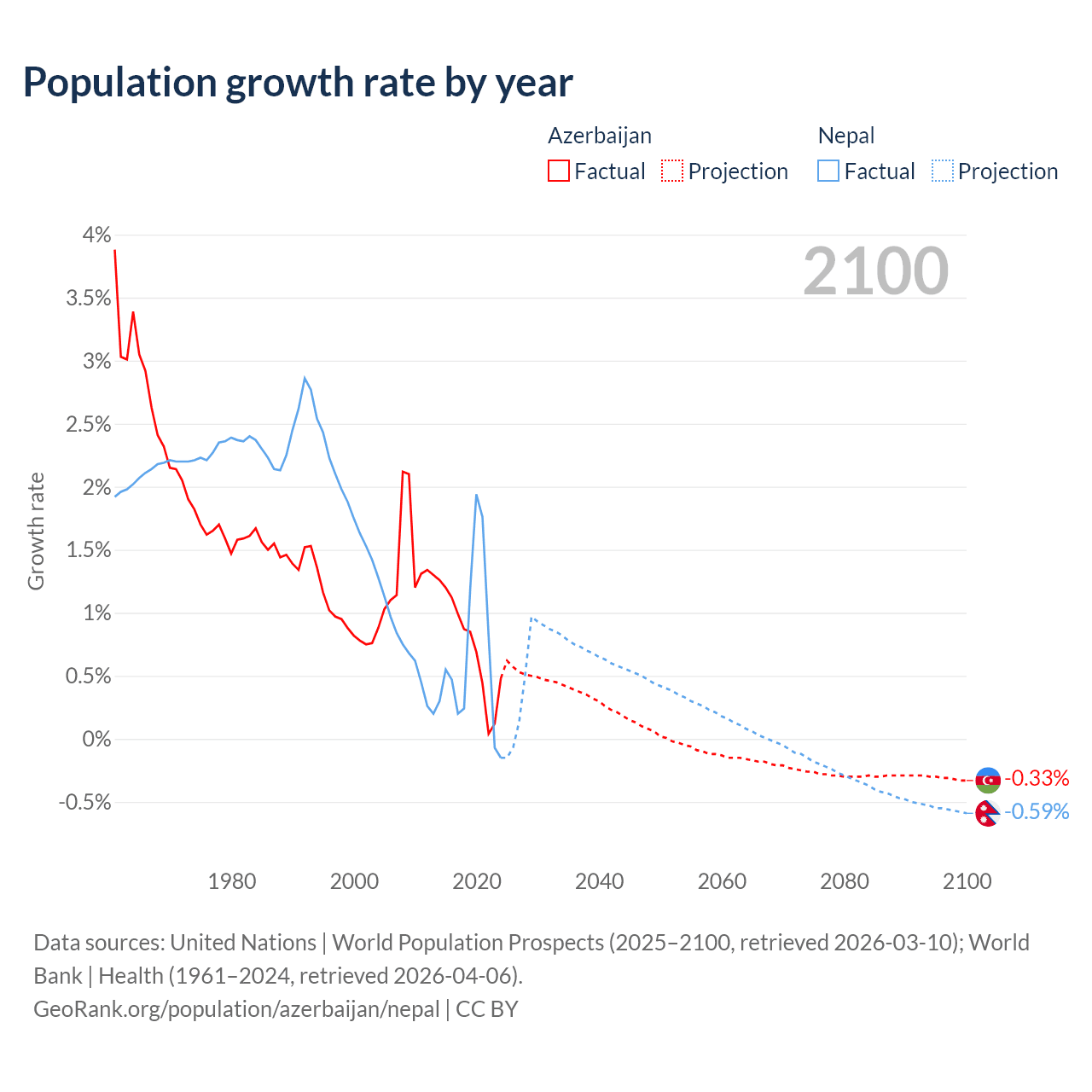 - For the last 10 years, Azerbaijan has had an average growth rate of +0.73% per year vs +0.66% in Nepal.