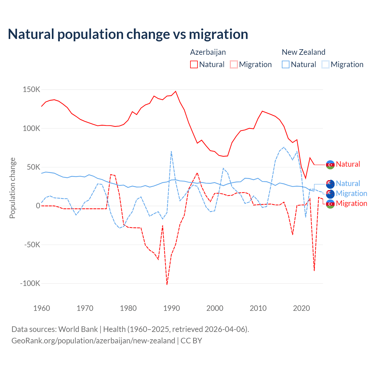 Over the last 10 years, 87.2% of the population change in Azerbaijan is from natural causes (a gain of 782,840 people) and 12.8% is from migration (a loss of 114,572 people). In New Zealand 34.4% is from natural causes (a gain of 247,767 people) and 65.6% is from migration (a gain of 471,602 people).
