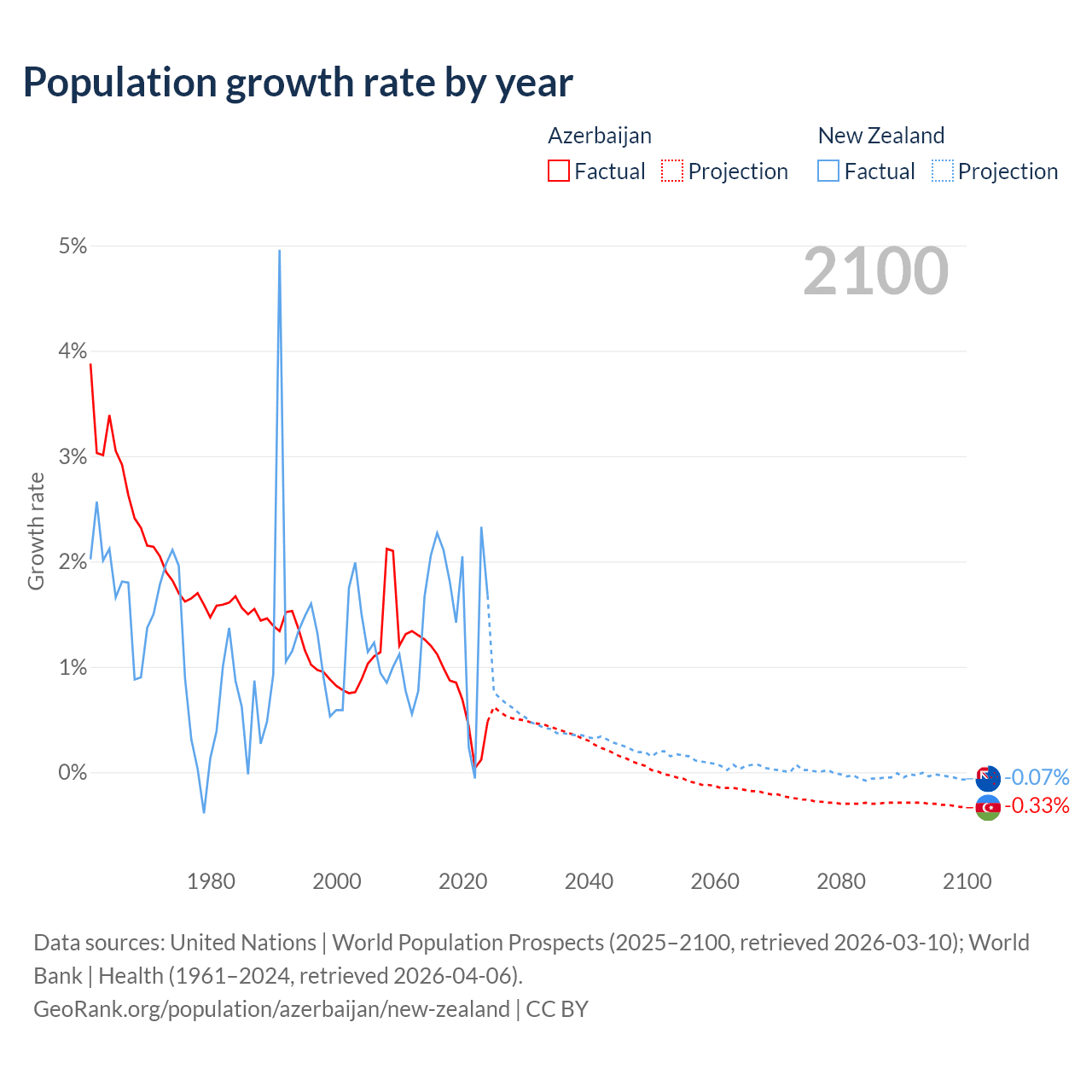 - For the last 10 years, Azerbaijan has had an average growth rate of +0.73% per year vs +1.6% in New Zealand.