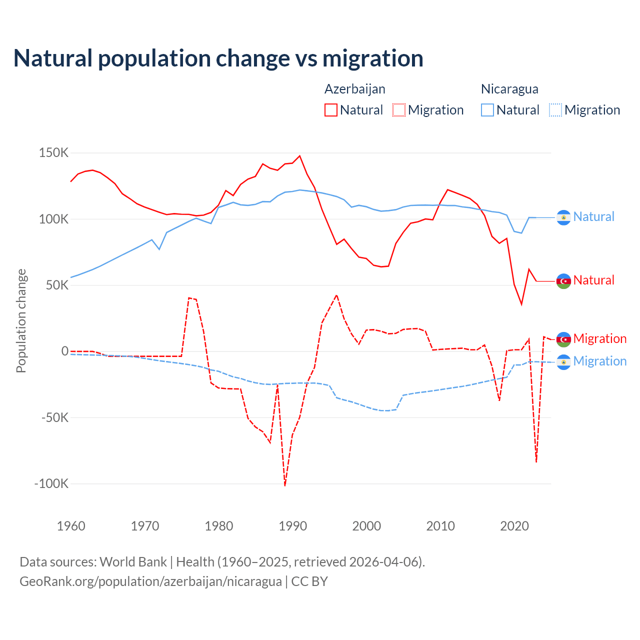 Over the last 10 years, 87.2% of the population change in Azerbaijan is from natural causes (a gain of 782,840 people) and 12.8% is from migration (a loss of 114,572 people). In Nicaragua 85.5% is from natural causes (a gain of 1,017,084 people) and 14.5% is from migration (a loss of 172,078 people).