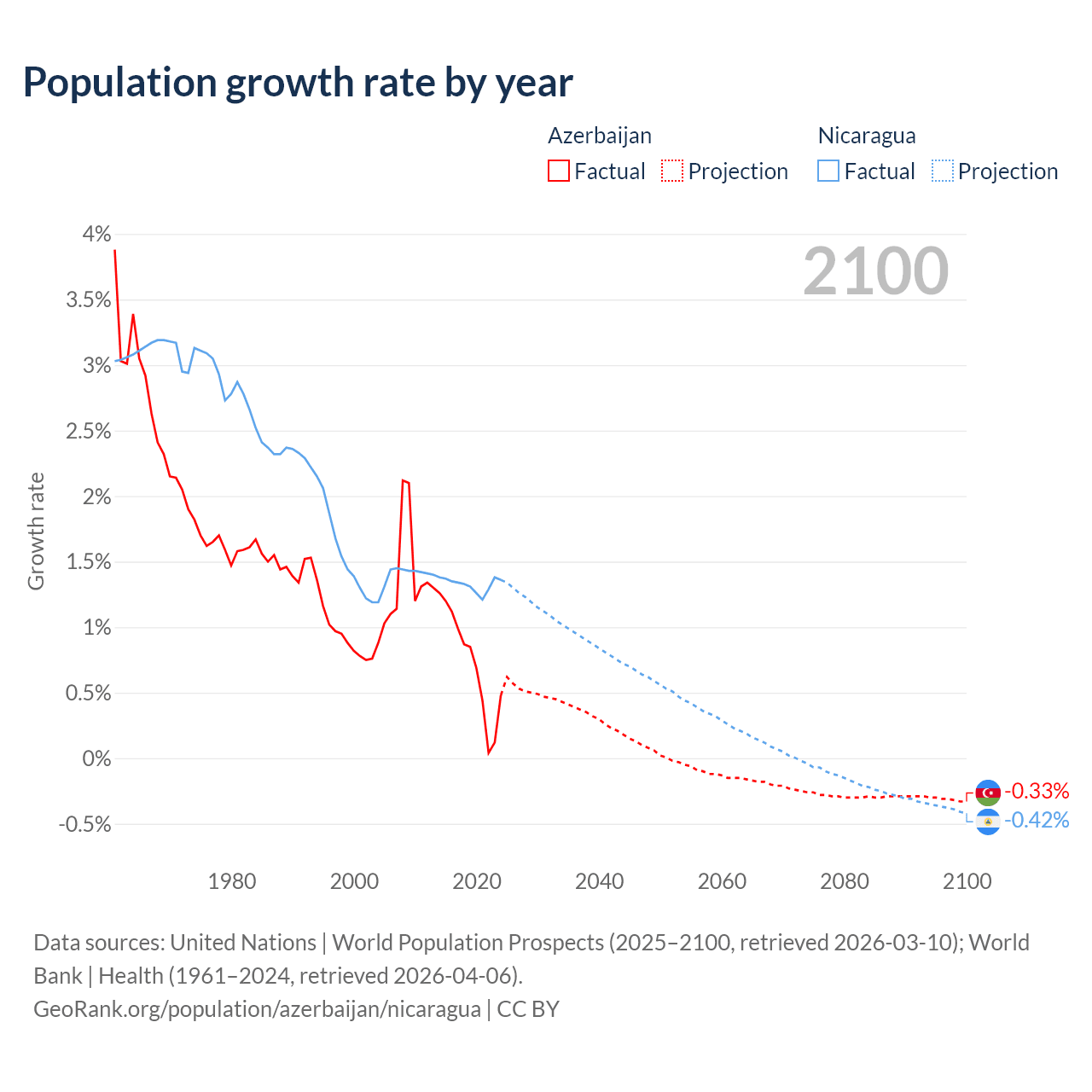 - For the last 10 years, Azerbaijan has had an average growth rate of +0.73% per year vs +1.33% in Nicaragua.