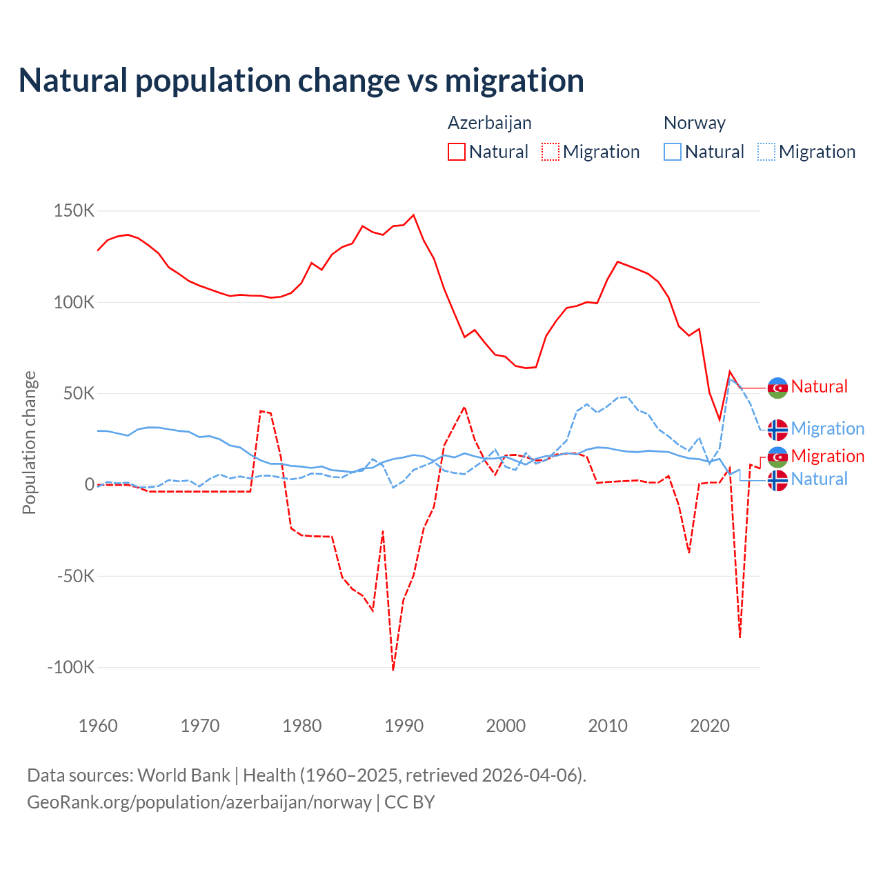 Over the last 10 years, 87.2% of the population change in Azerbaijan is from natural causes (a gain of 782,840 people) and 12.8% is from migration (a loss of 114,572 people). In Norway 31.3% is from natural causes (a gain of 138,699 people) and 68.7% is from migration (a gain of 303,945 people).
