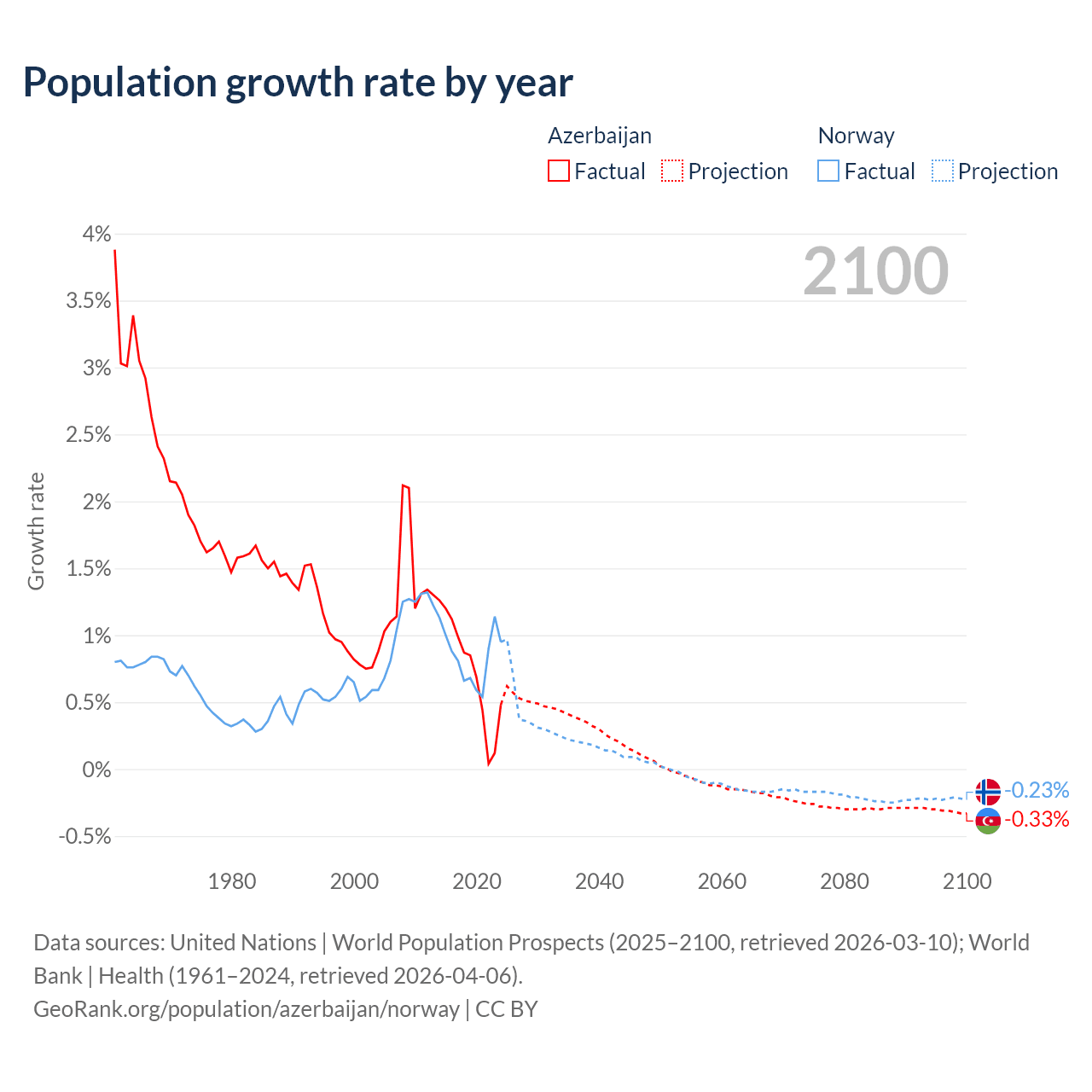 - For the last 10 years, Azerbaijan has had an average growth rate of +0.73% per year vs +0.85% in Norway.