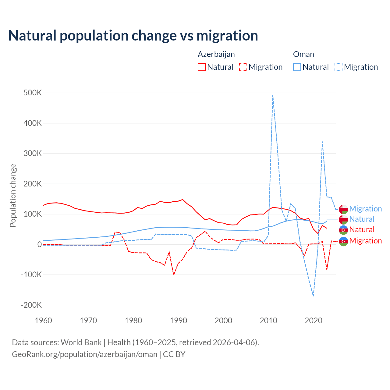 Over the last 10 years, 87.2% of the population change in Azerbaijan is from natural causes (a gain of 782,840 people) and 12.8% is from migration (a loss of 114,572 people). In Oman 61.6% is from natural causes (a gain of 763,049 people) and 38.4% is from migration (a gain of 475,565 people).