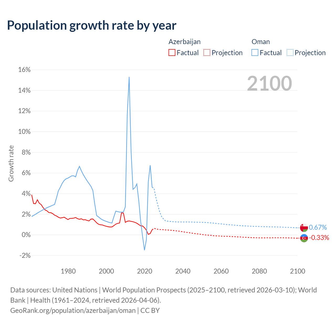- For the last 10 years, Azerbaijan has had an average growth rate of +0.73% per year vs +2.99% in Oman.