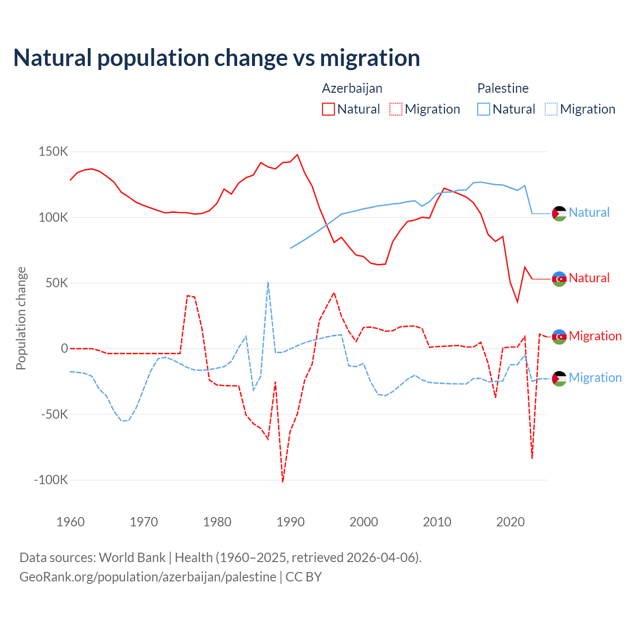 Over the last 10 years, 87.2% of the population change in Azerbaijan is from natural causes (a gain of 782,840 people) and 12.8% is from migration (a loss of 114,572 people). In Palestine 85.7% is from natural causes (a gain of 1,218,010 people) and 14.3% is from migration (a loss of 202,820 people).