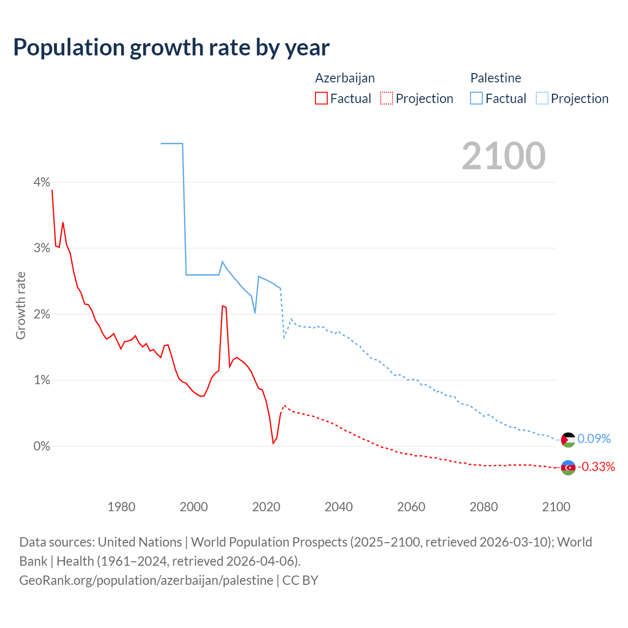 - For the last 10 years, Azerbaijan has had an average growth rate of +0.73% per year vs +2.4% in Palestine.