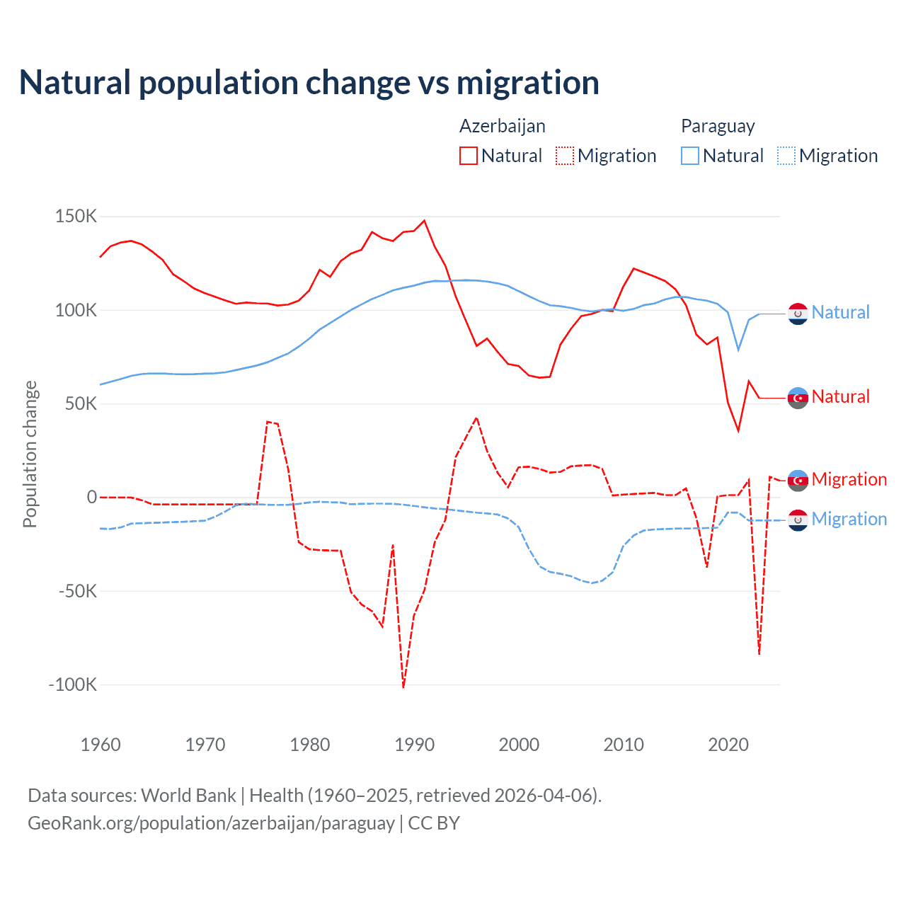 Over the last 10 years, 87.2% of the population change in Azerbaijan is from natural causes (a gain of 782,840 people) and 12.8% is from migration (a loss of 114,572 people). In Paraguay 87.6% is from natural causes (a gain of 1,002,636 people) and 12.4% is from migration (a loss of 141,377 people).