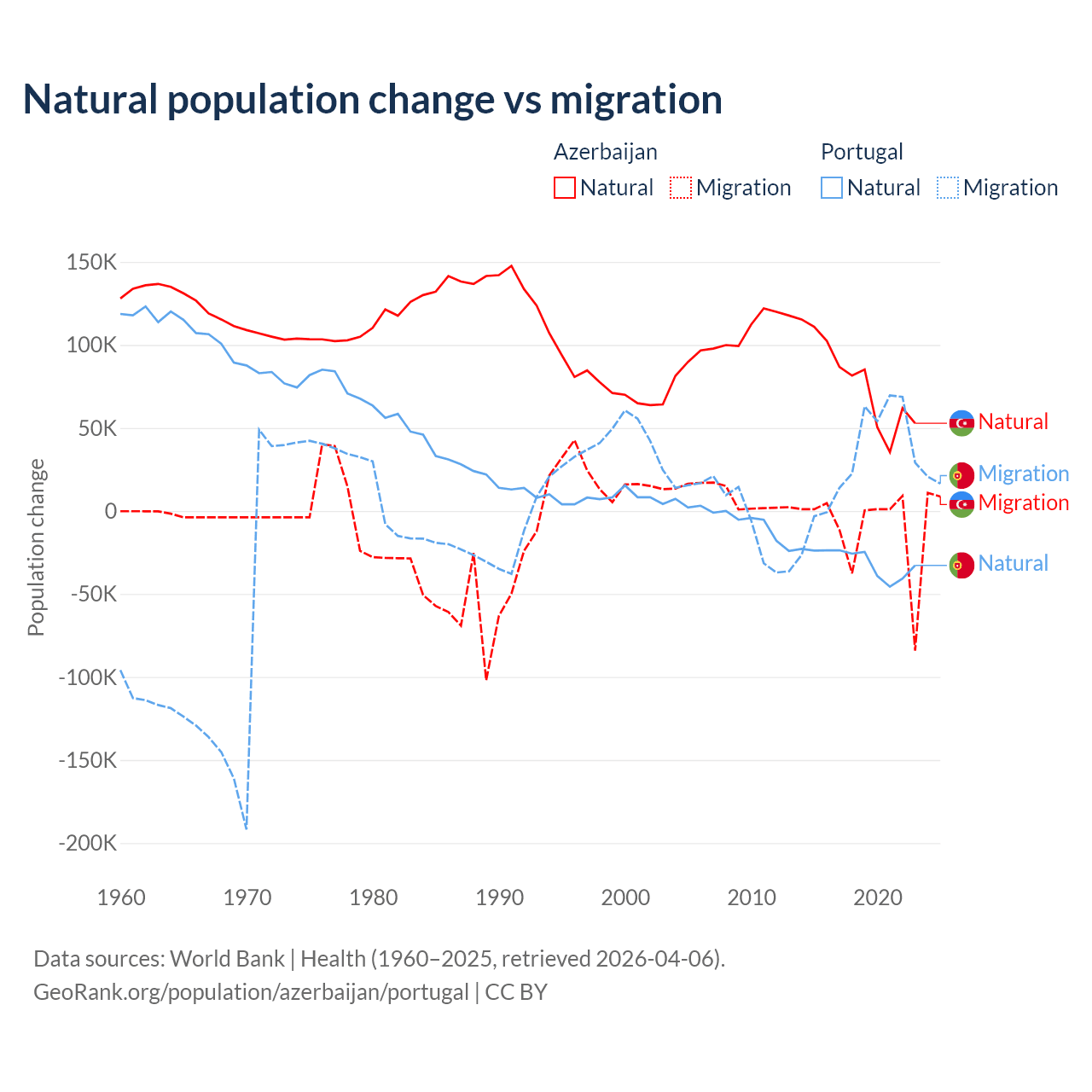 Over the last 10 years, 87.2% of the population change in Azerbaijan is from natural causes (a gain of 782,840 people) and 12.8% is from migration (a loss of 114,572 people). In Portugal 51% is from natural causes (a loss of 302,748 people) and 49% is from migration (a gain of 290,554 people).