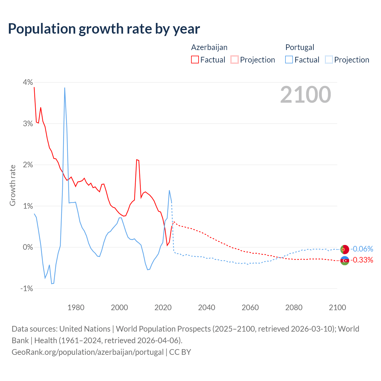 - For the last 10 years, Azerbaijan has had an average growth rate of +0.73% per year vs +0.21% in Portugal.