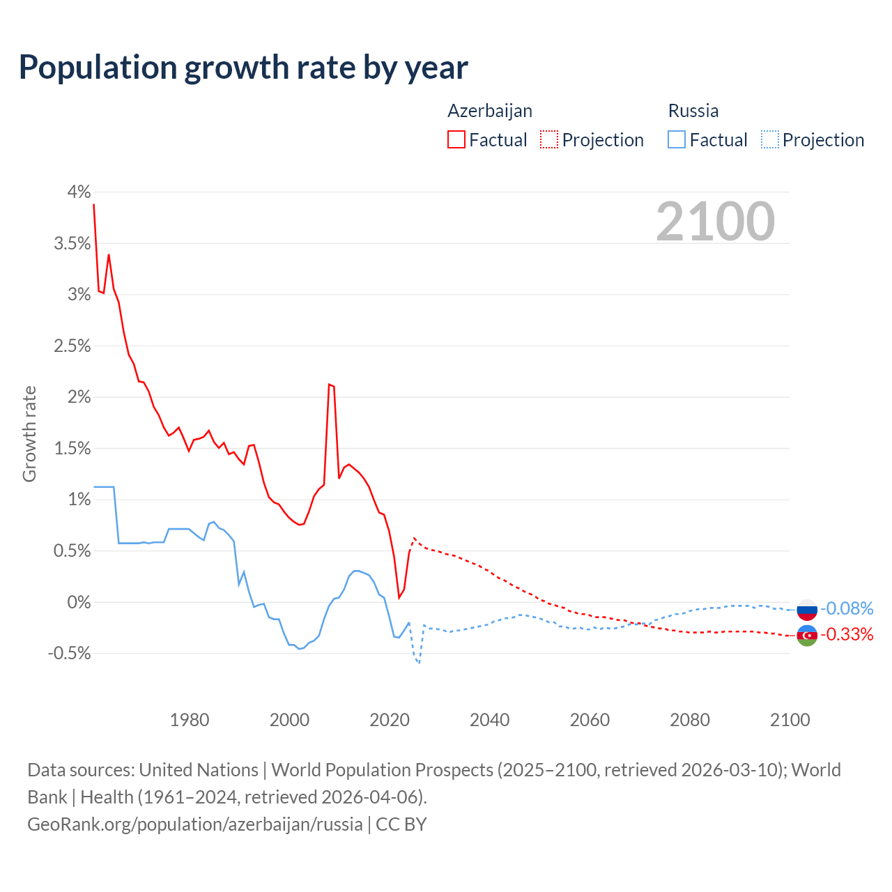 - For the last 10 years, Azerbaijan has had an average growth rate of +0.73% per year vs -0.02% in Russia.
