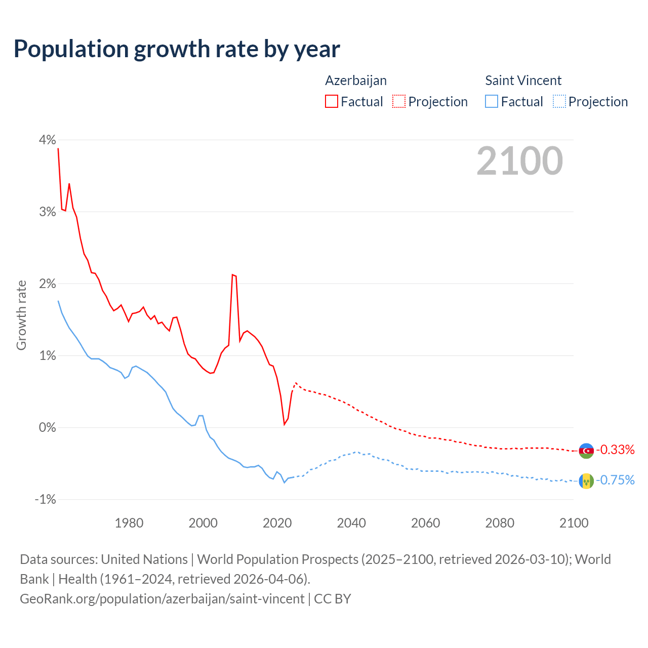 - For the last 10 years, Azerbaijan has had an average growth rate of +0.73% per year vs -0.65% in Saint Vincent.