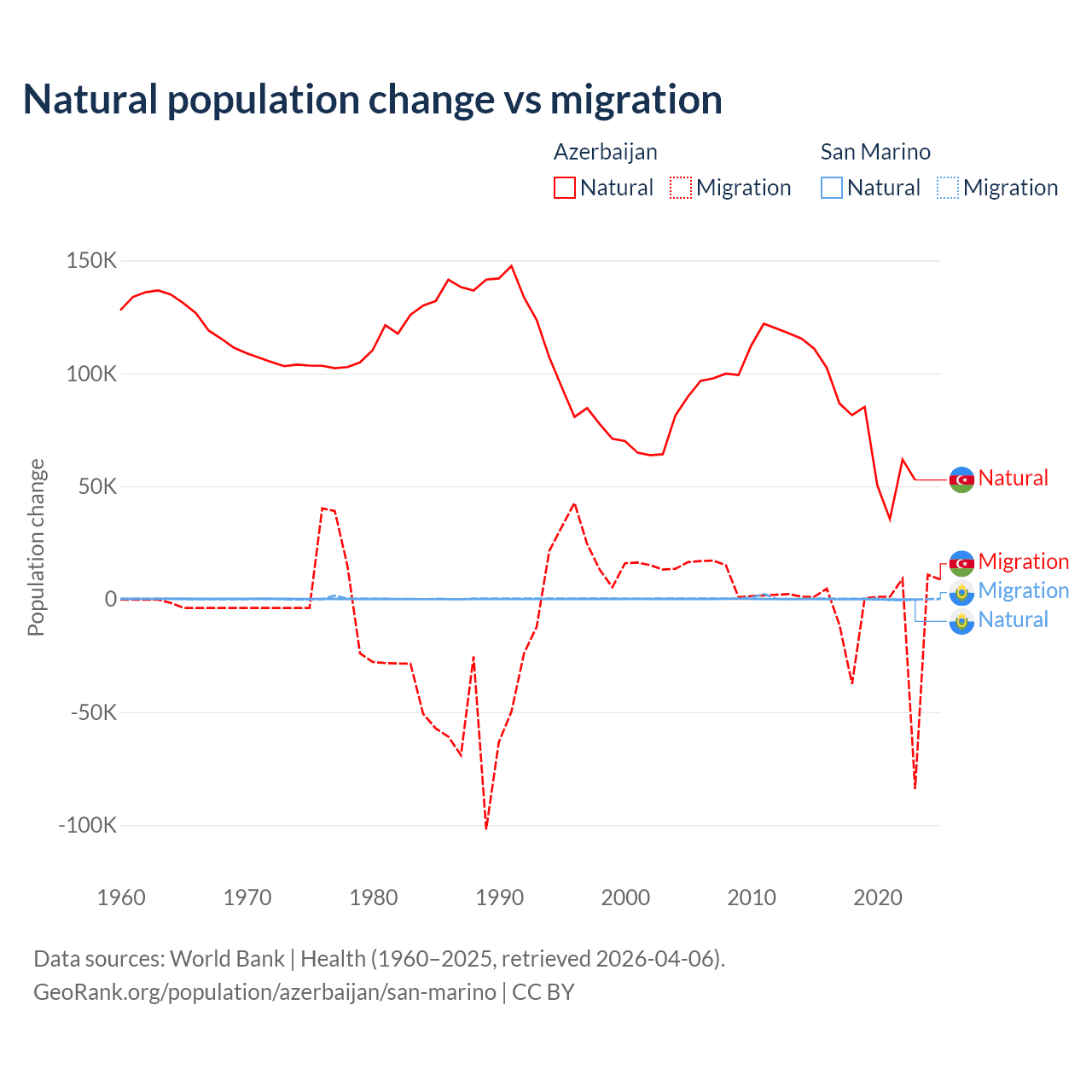 Over the last 10 years, 87.2% of the population change in Azerbaijan is from natural causes (a gain of 782,840 people) and 12.8% is from migration (a loss of 114,572 people). In San Marino 40.9% is from natural causes (a loss of 358 people) and 59.1% is from migration (a gain of 517 people).