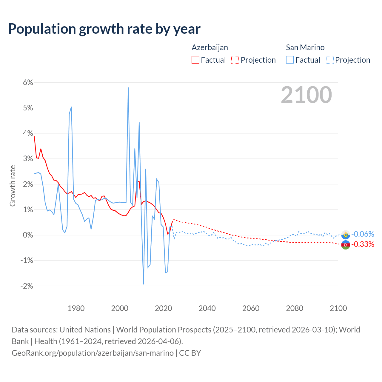 Data sources: World Bank | Health (1960–2024, retrieved 2026-04-06); United Nations | World Population Prospects (1960–2026, retrieved 2026-03-10); U.S. Census Bureau (1960–2025, retrieved 2026-02-08); Central Intelligence Agency (CIA) (2000–2019, retrieved 2026-02-20).