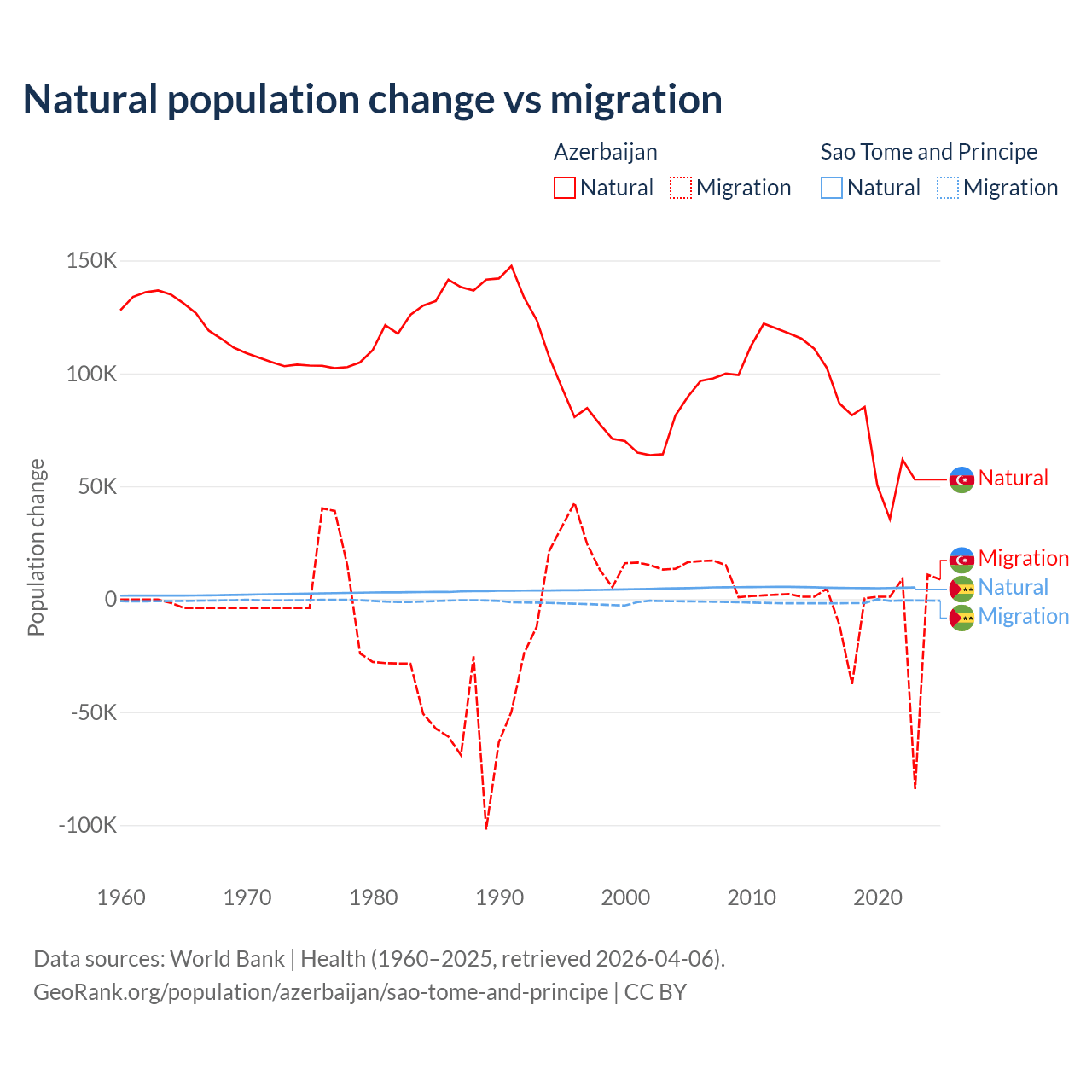 Over the last 10 years, 87.2% of the population change in Azerbaijan is from natural causes (a gain of 782,840 people) and 12.8% is from migration (a loss of 114,572 people). In Sao Tome and Principe 80.1% is from natural causes (a gain of 50,822 people) and 19.9% is from migration (a loss of 12,621 people).