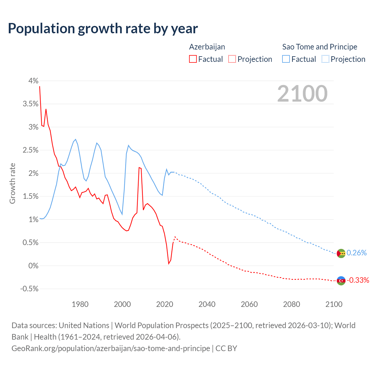 - For the last 10 years, Azerbaijan has had an average growth rate of +0.73% per year vs +1.82% in Sao Tome and Principe.