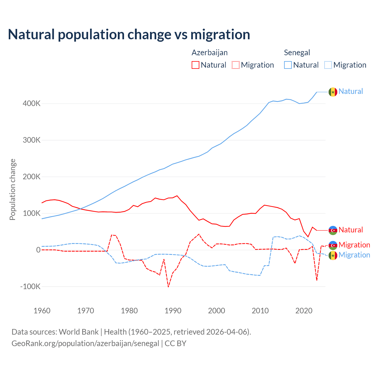 Over the last 10 years, 87.2% of the population change in Azerbaijan is from natural causes (a gain of 782,840 people) and 12.8% is from migration (a loss of 114,572 people). In Senegal 93.9% is from natural causes (a gain of 4,089,205 people) and 6.13% is from migration (a gain of 267,266 people).