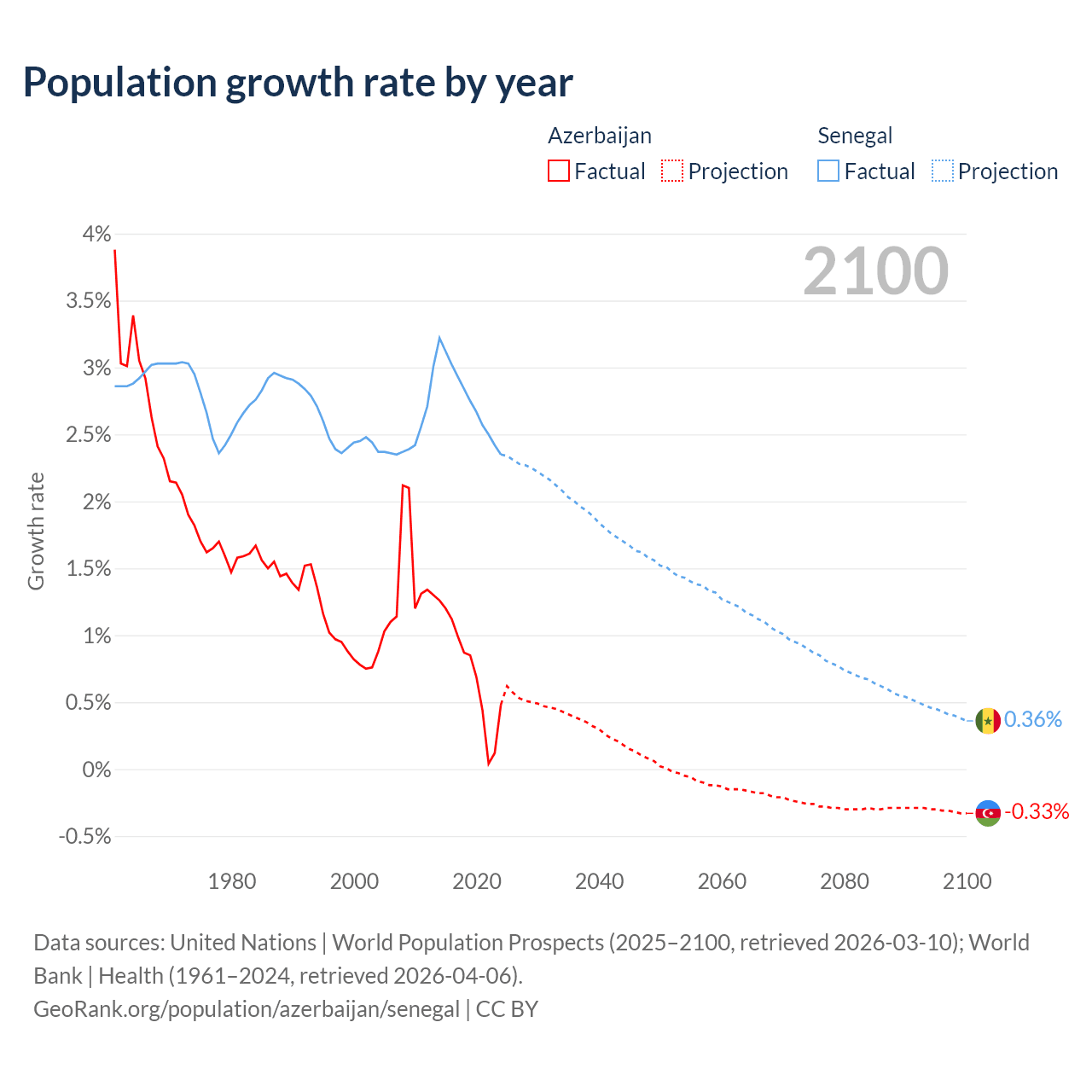- For the last 10 years, Azerbaijan has had an average growth rate of +0.73% per year vs +2.76% in Senegal.