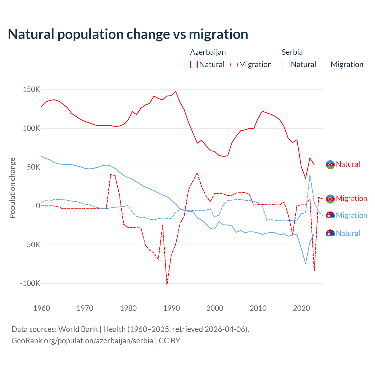Over the last 10 years, 87.2% of the population change in Azerbaijan is from natural causes (a gain of 782,840 people) and 12.8% is from migration (a loss of 114,572 people). In Serbia 83.3% is from natural causes (a loss of 435,148 people) and 16.7% is from migration (a loss of 87,110 people).
