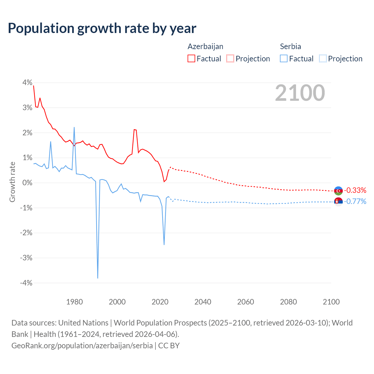 - For the last 10 years, Azerbaijan has had an average growth rate of +0.73% per year vs -0.76% in Serbia.