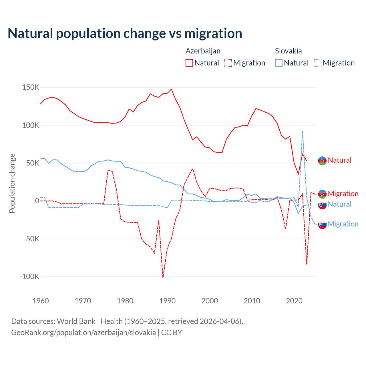 Over the last 10 years, 87.2% of the population change in Azerbaijan is from natural causes (a gain of 782,840 people) and 12.8% is from migration (a loss of 114,572 people). In Slovakia 7.47% is from natural causes (a loss of 8,728 people) and 92.5% is from migration (a gain of 108,156 people).