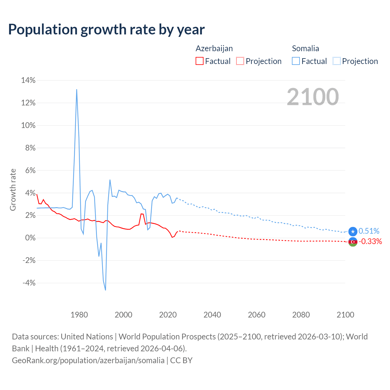 - For the last 10 years, Azerbaijan has had an average growth rate of +0.73% per year vs +3.61% in Somalia.
