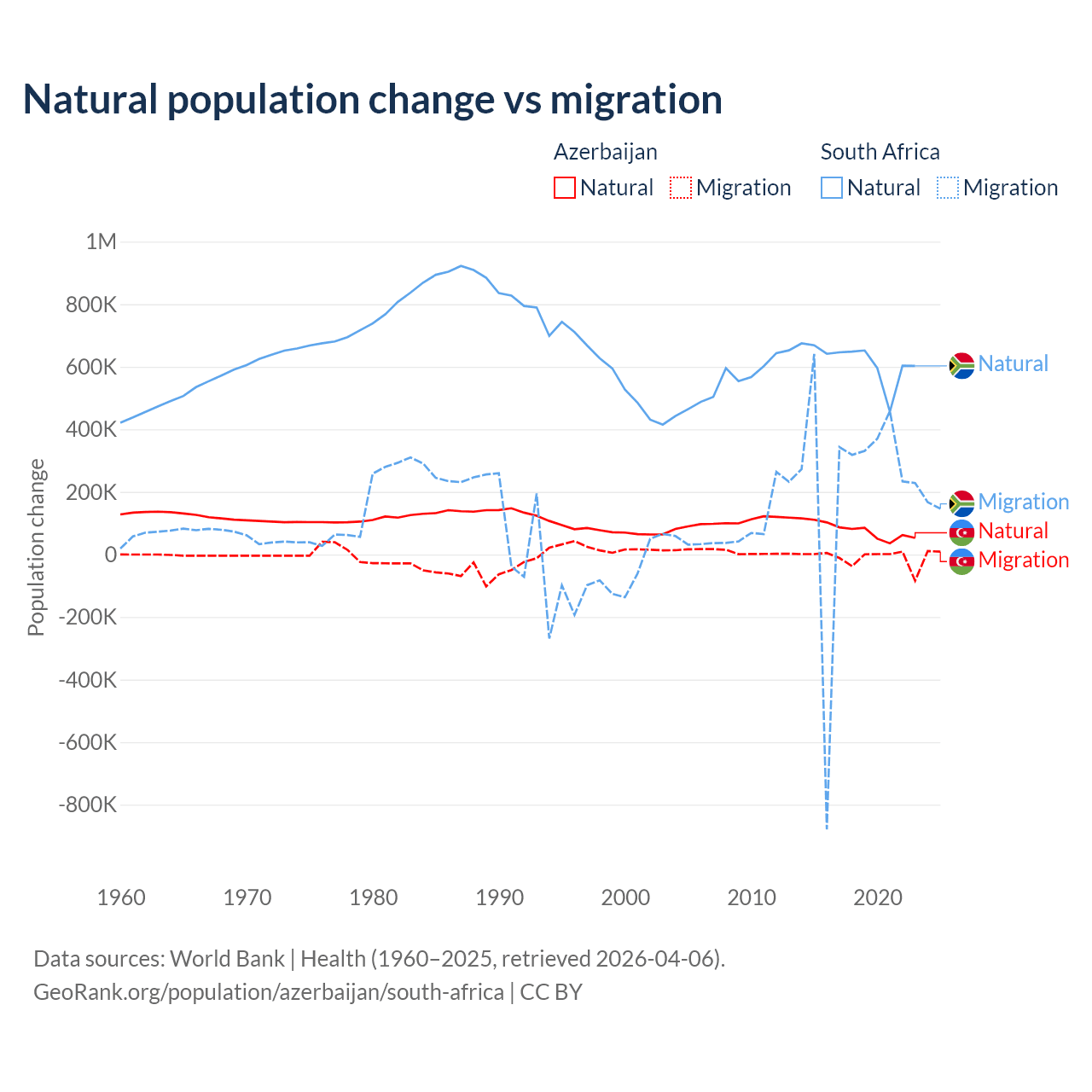 Over the last 10 years, 87.2% of the population change in Azerbaijan is from natural causes (a gain of 782,840 people) and 12.8% is from migration (a loss of 114,572 people). In South Africa 72.8% is from natural causes (a gain of 6,190,027 people) and 27.2% is from migration (a gain of 2,316,795 people).