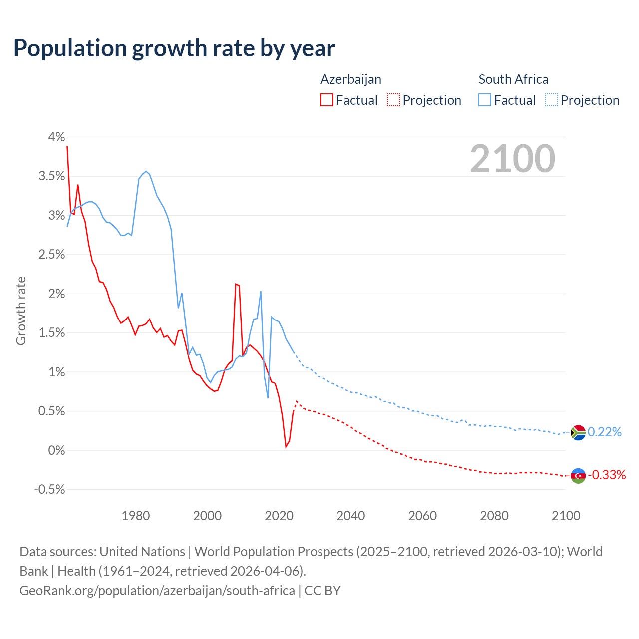 - For the last 10 years, Azerbaijan has had an average growth rate of +0.73% per year vs +1.44% in South Africa.