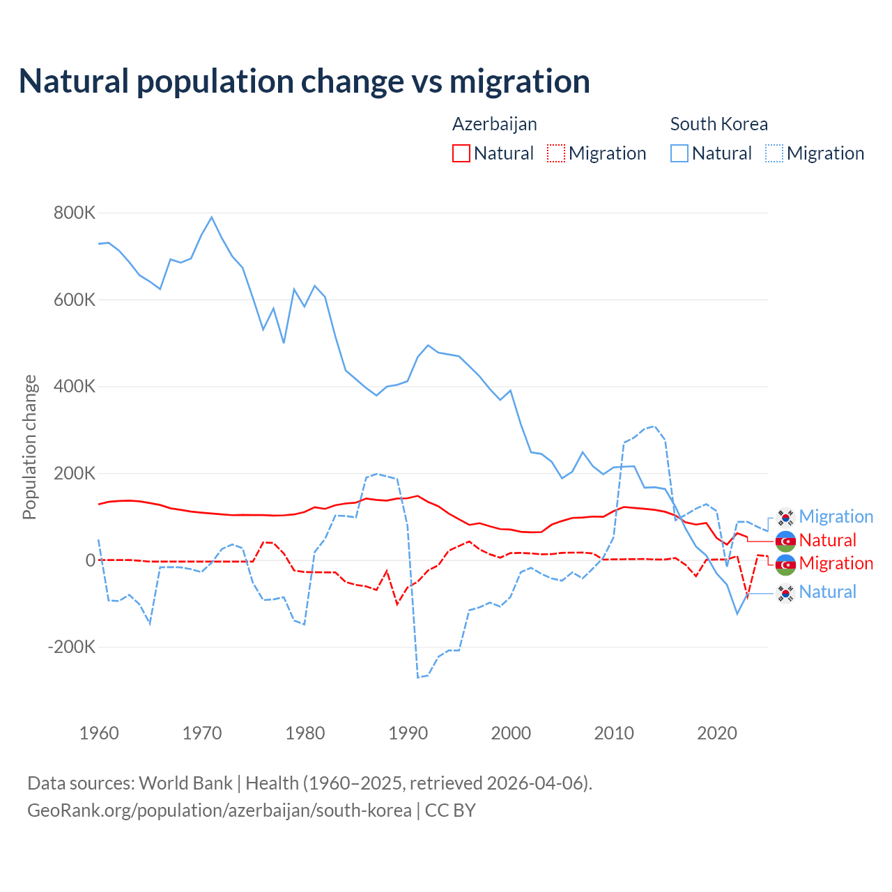 Over the last 10 years, 87.2% of the population change in Azerbaijan is from natural causes (a gain of 782,840 people) and 12.8% is from migration (a loss of 114,572 people). In South Korea 17.6% is from natural causes (a gain of 277,215 people) and 82.4% is from migration (a gain of 1,298,356 people).