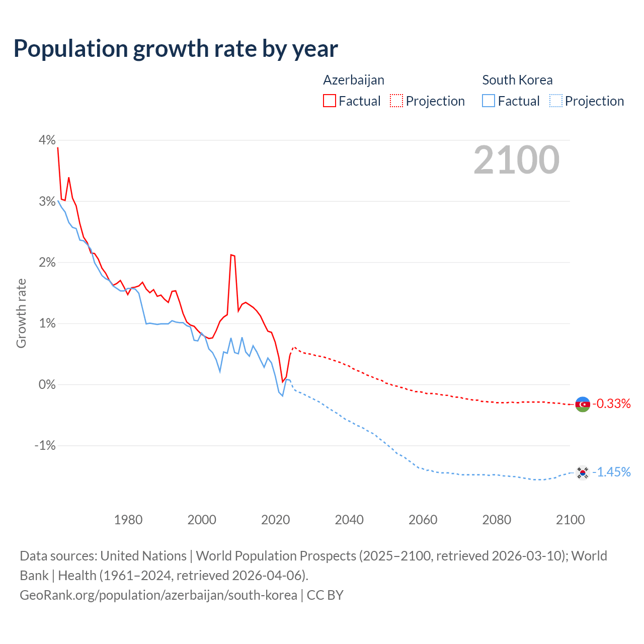 - For the last 10 years, Azerbaijan has had an average growth rate of +0.73% per year vs +0.24% in South Korea.
