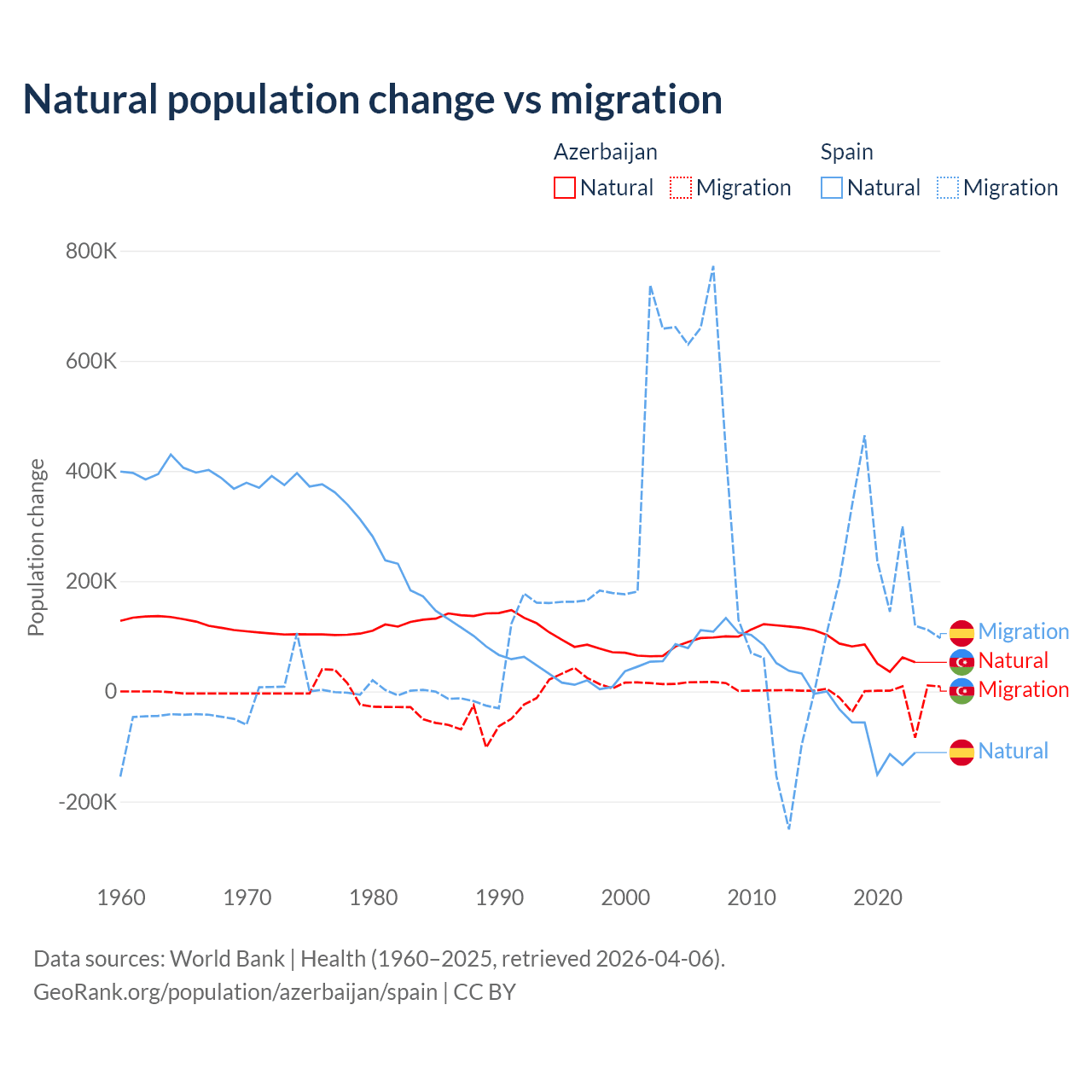 Over the last 10 years, 87.2% of the population change in Azerbaijan is from natural causes (a gain of 782,840 people) and 12.8% is from migration (a loss of 114,572 people). In Spain 25.8% is from natural causes (a loss of 627,829 people) and 74.2% is from migration (a gain of 1,810,127 people).