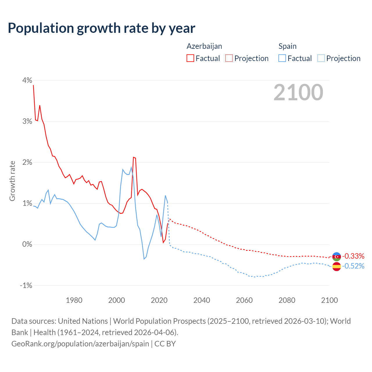 - For the last 10 years, Azerbaijan has had an average growth rate of +0.73% per year vs +0.43% in Spain.