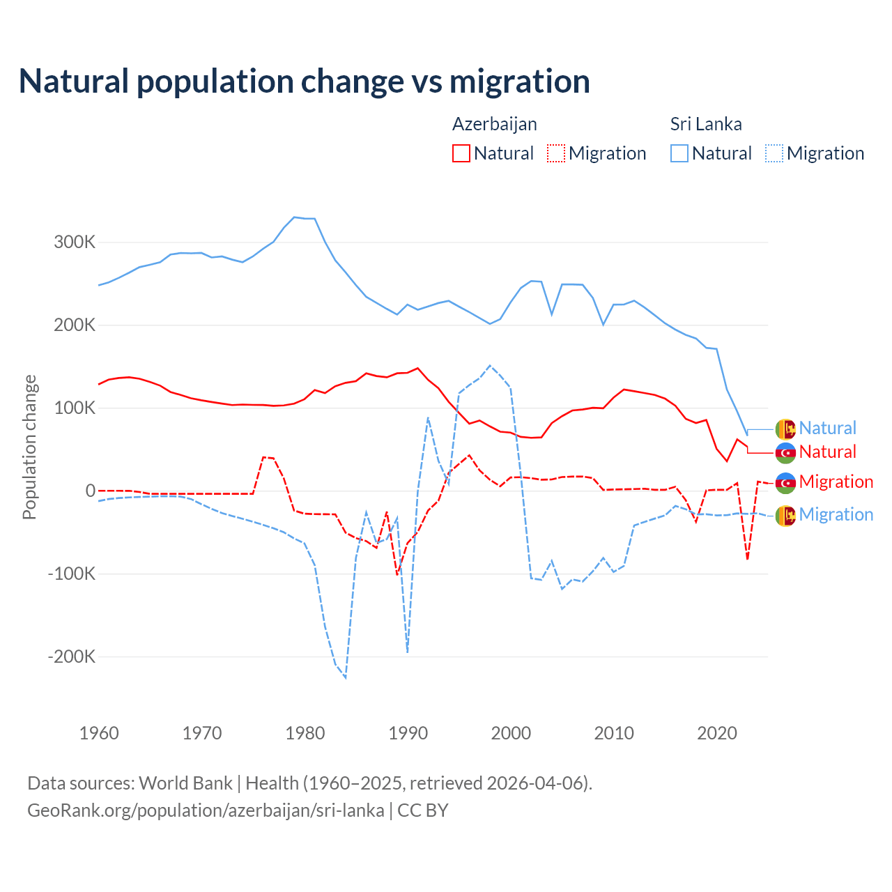 Over the last 10 years, 87.2% of the population change in Azerbaijan is from natural causes (a gain of 782,840 people) and 12.8% is from migration (a loss of 114,572 people). In Sri Lanka 85.3% is from natural causes (a gain of 1,605,749 people) and 14.7% is from migration (a loss of 276,121 people).