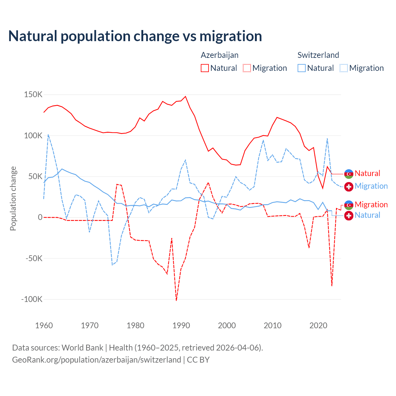 Over the last 10 years, 87.2% of the population change in Azerbaijan is from natural causes (a gain of 782,840 people) and 12.8% is from migration (a loss of 114,572 people). In Switzerland 21.6% is from natural causes (a gain of 165,354 people) and 78.4% is from migration (a gain of 600,145 people).