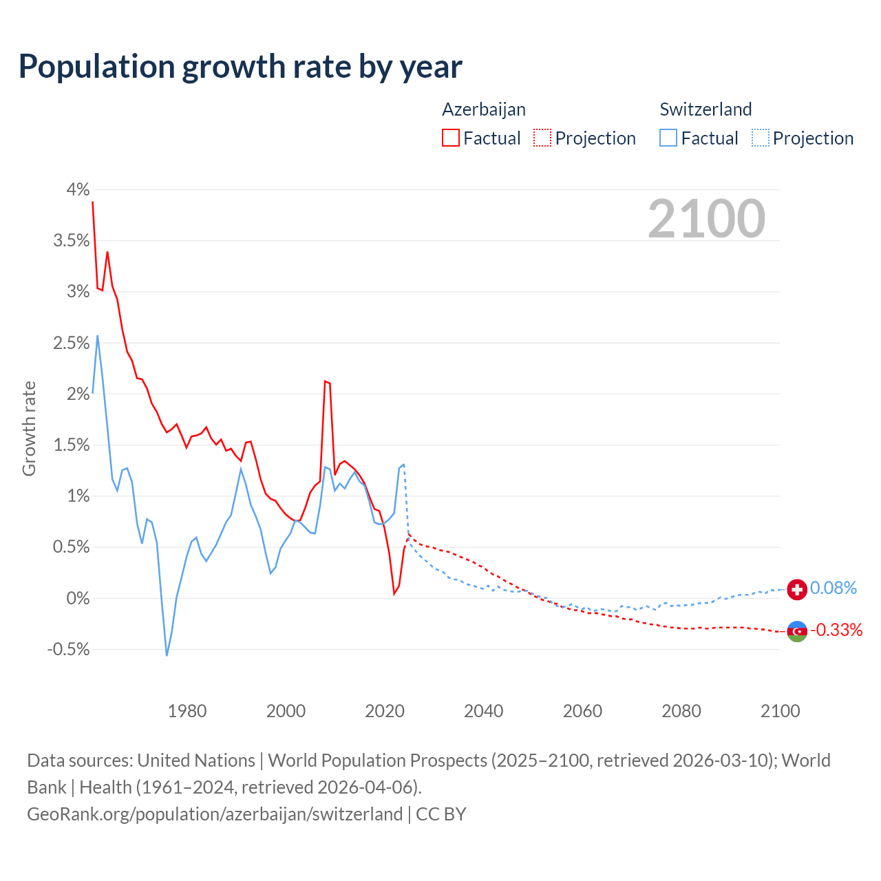 - For the last 10 years, Azerbaijan has had an average growth rate of +0.73% per year vs +0.98% in Switzerland.